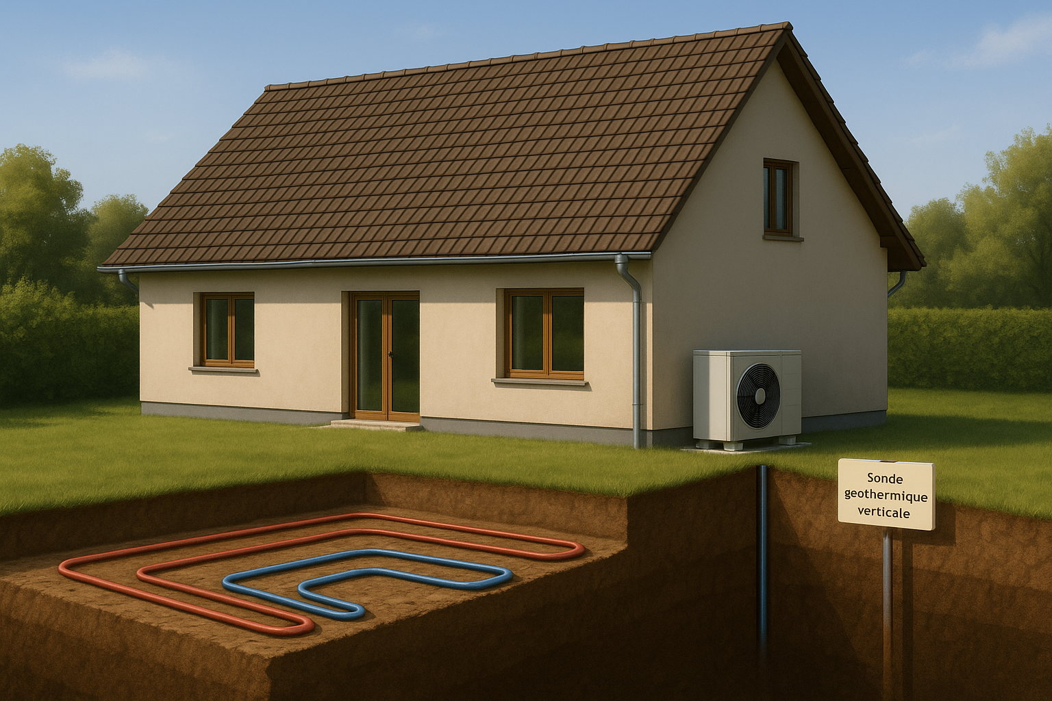Un terrain suffisamment grand et dégagé est nécessaire pour un captage horizontal. Si l’espace est limité, un forage vertical peut être réalisé, mais il nécessite une étude de faisabilité et un sol adapté.